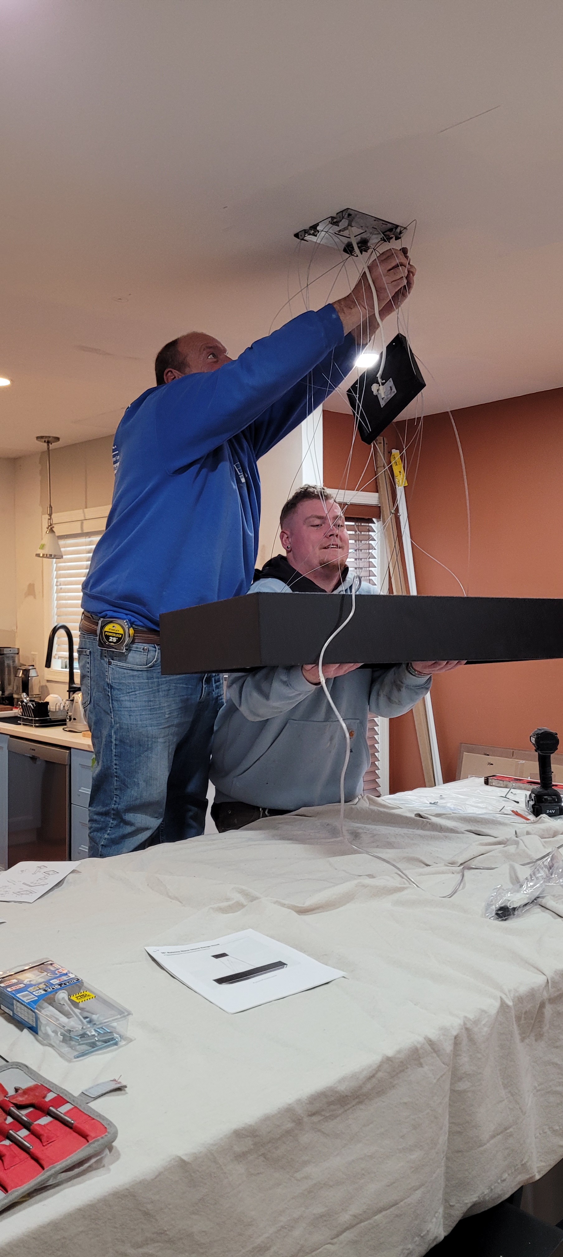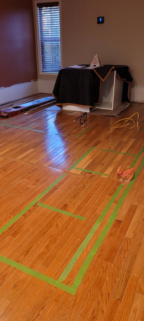 Thankfully, while we were obsessing over tape, other things were happening — lighting went up, floors went down. A mini-meltdown on Friday bubbled up when the crew opened up the hardwood boxes (that were the exact same make/model/color) as our old, but for some reason were distinctly different which meant feathering them in was going to be a challenge.