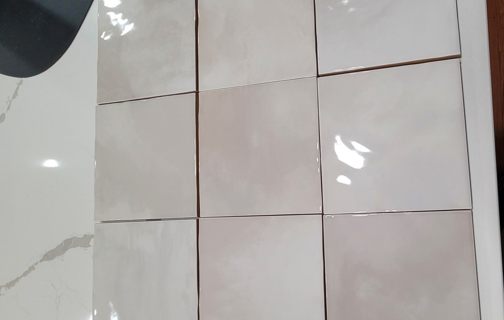 I do not know how they not only managed to align the tile so perfectly along the ceiling and the wall, but one of the drawbacks to stacked tile is that it can get crooked really quickly. Ours is straight as an arrow and miraculously, along the shelves, there is not gapping or mis-leveled grout lines. It is a miracle, I tell ya.