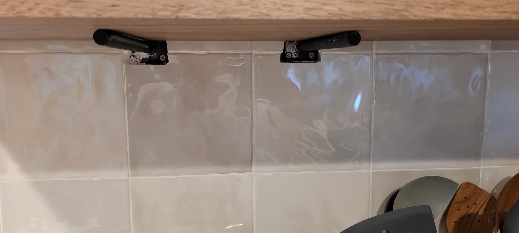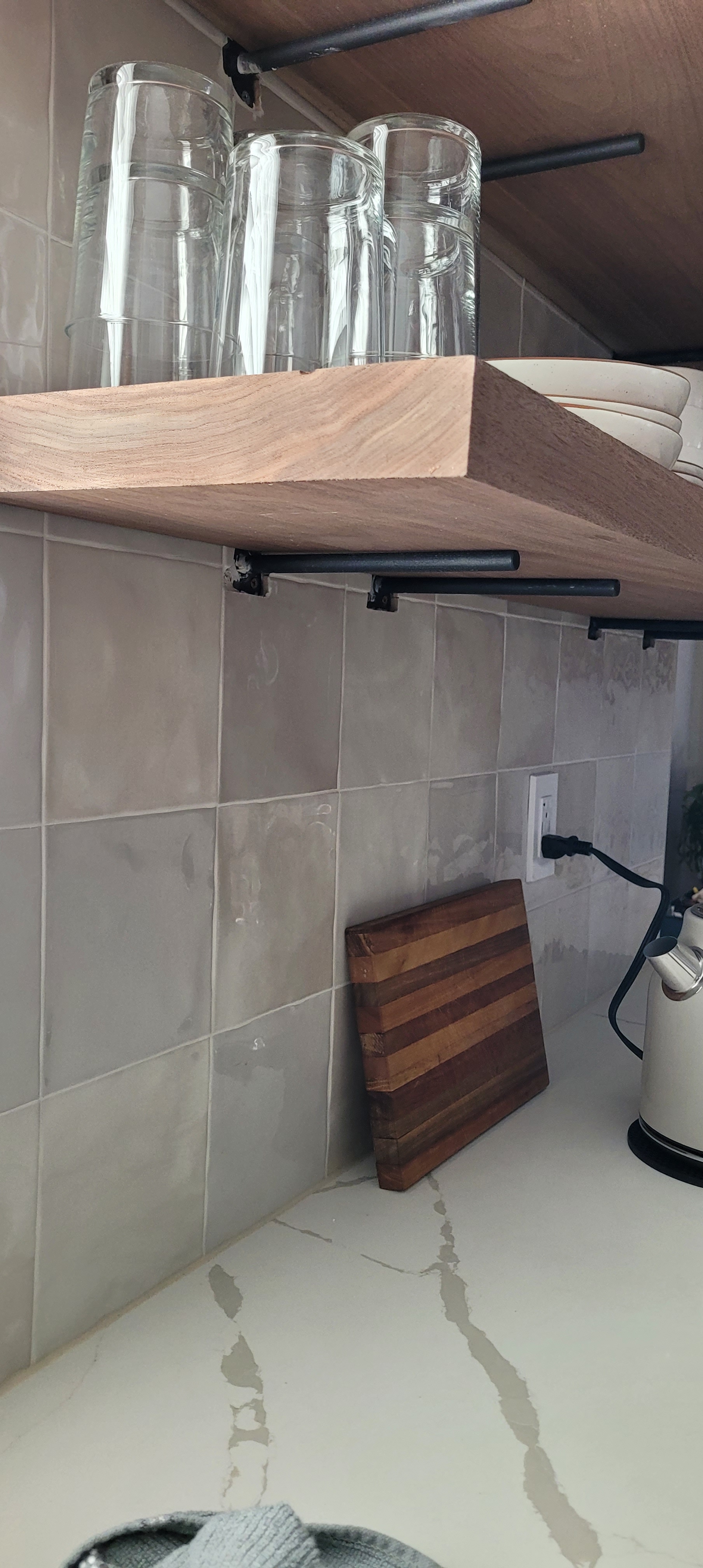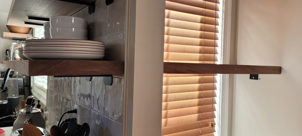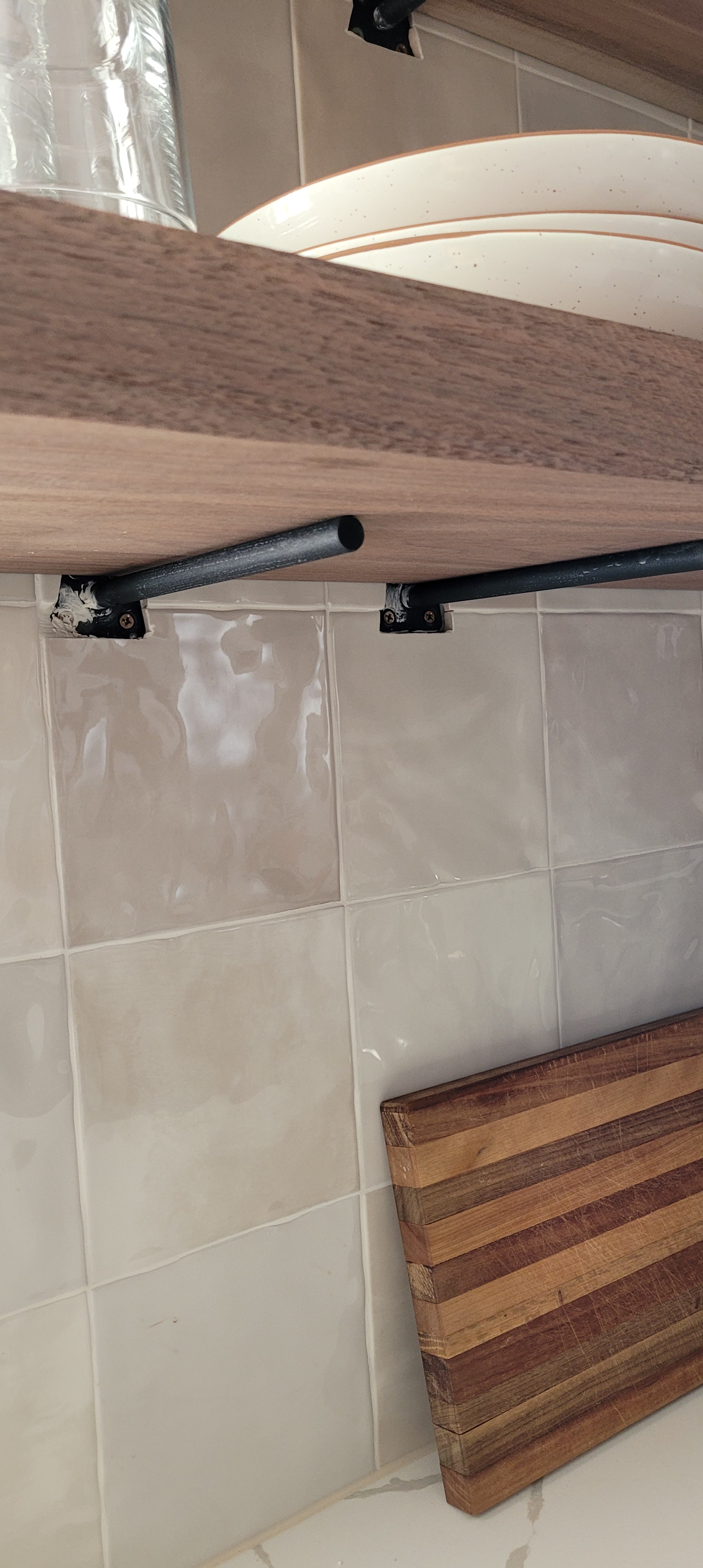 You’ll see in the photos below, the (VERY) hard walnut wood shelves are show-stopping gorgeous. But, the system that we chose, after exhaustive research (and reading every review possible), was causing problems for us and our gloriously new stacked tile wall.
