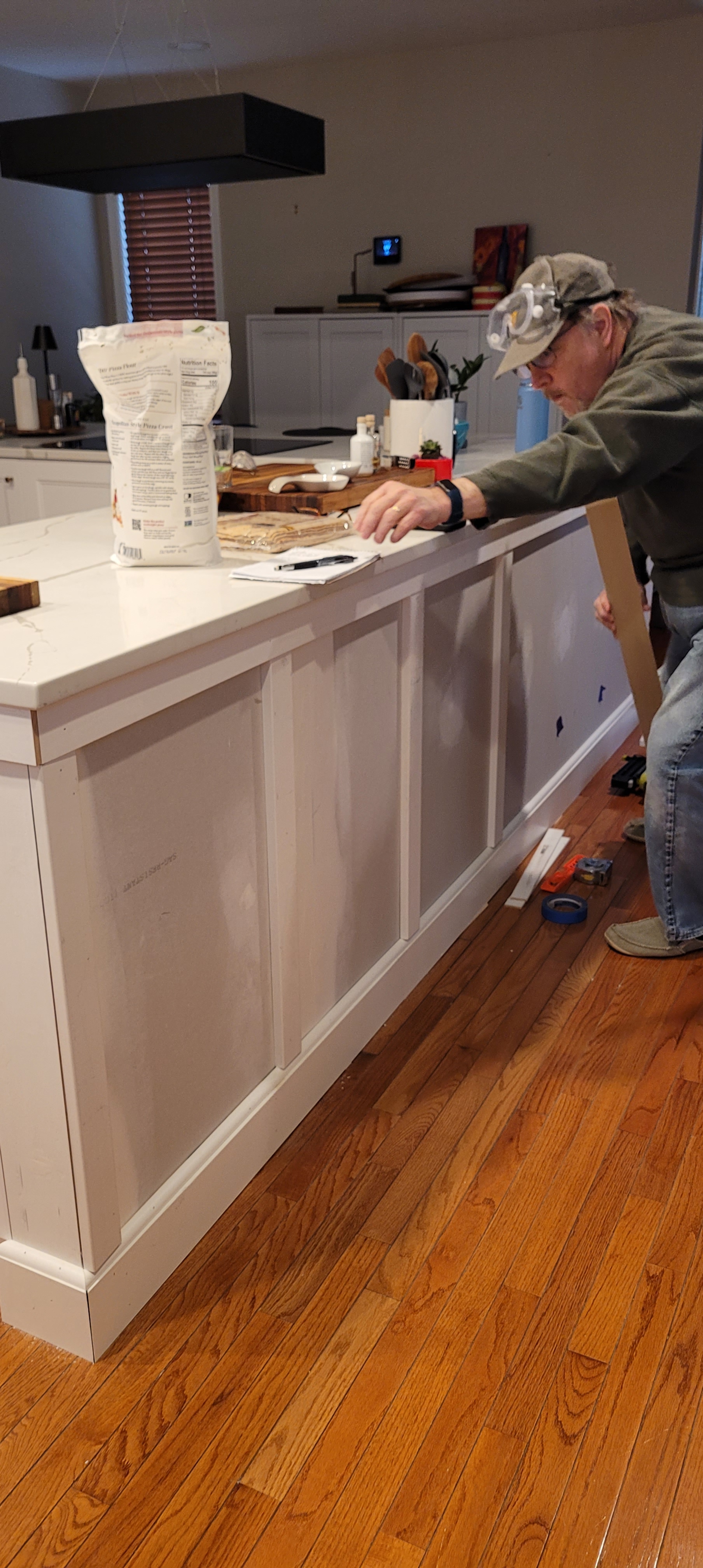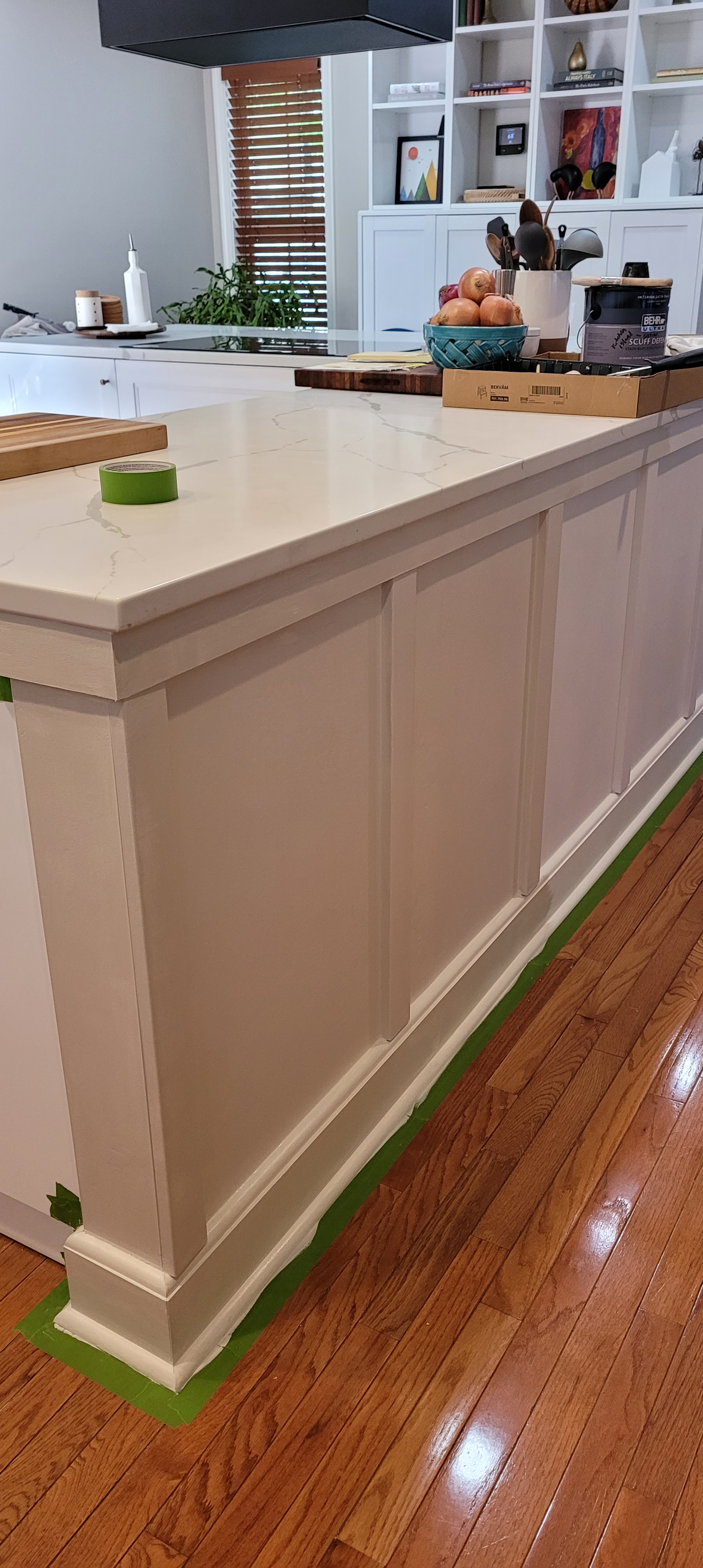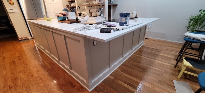 We had always assumed we would do box trim on the island. But, there are so many bump-outs and angles that it was becoming waaaaay too busy and psychedelic for our taste. Instead, we opted for…you guessed it…a much simpler hybrid board-and-batten trim that looks way better than the box trim. Less fussy, more in keeping with the clean style of the kitchen and dining room, and the rest of the house, as well.