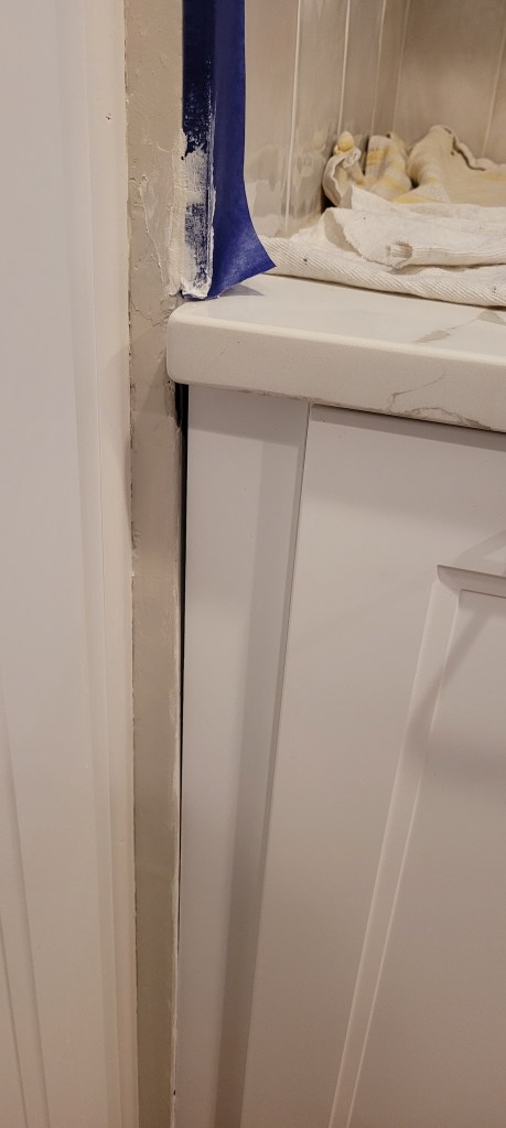 When we had the tile installed, there were gaps between the tile and the wall on the visible side of the Schluter edge. We thought the tile guy would have taken care of it, but the tile guy said that was the paint guy’s job. Little did he know, we were the paint guy! So, while we wait for our brain cells to kick into high shelf-installing gear, I’m in caulking mode. Below the countertop will go some scribe for those big gaps, but the rest has to be caulked. So much caulking.