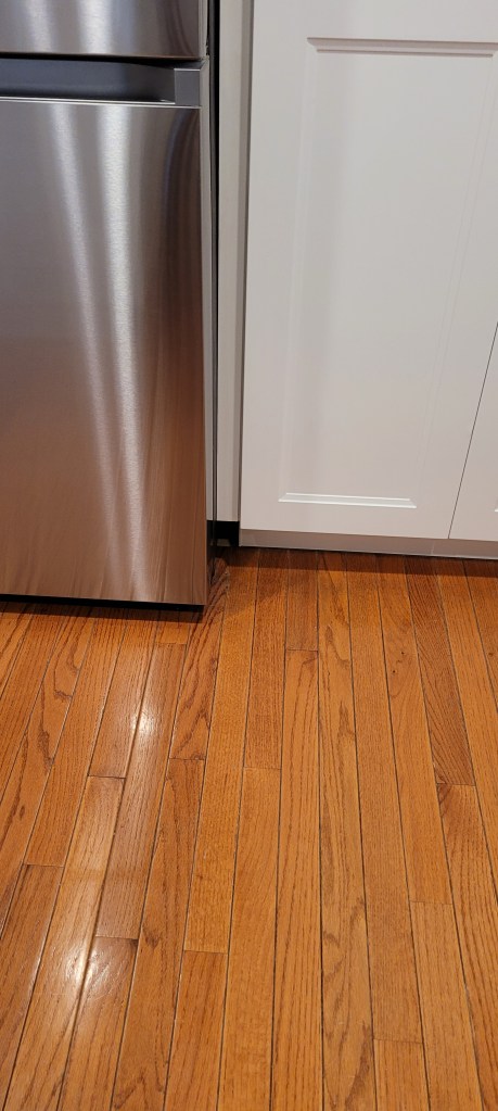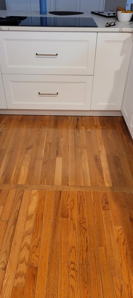 Insult to injury came when they said they could not “lace” the two floors together. I think it coulda been done and I regret not nudging a little more forcefully. I can only say we were still in shock at seeing the two different colors side by side to pay much attention to the HORI-FLIPPING-ZONTAL line that is now in the galley part of our kitchen.