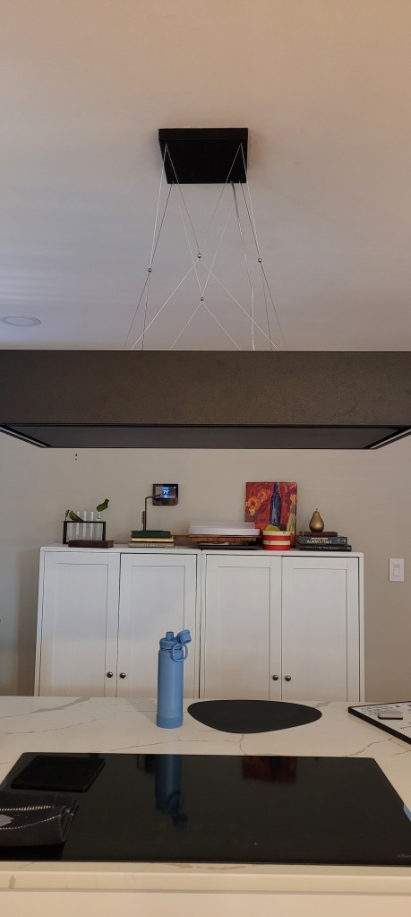 Anyway, upon installation the contractor got lost in all the cables and cords that make up the art installation part of the thing, criss-crossing cables, marring our brand-new ceiling and hanging the damn thing an inch off center. We will be fixing it ourselves, but we ain’t happy about it.