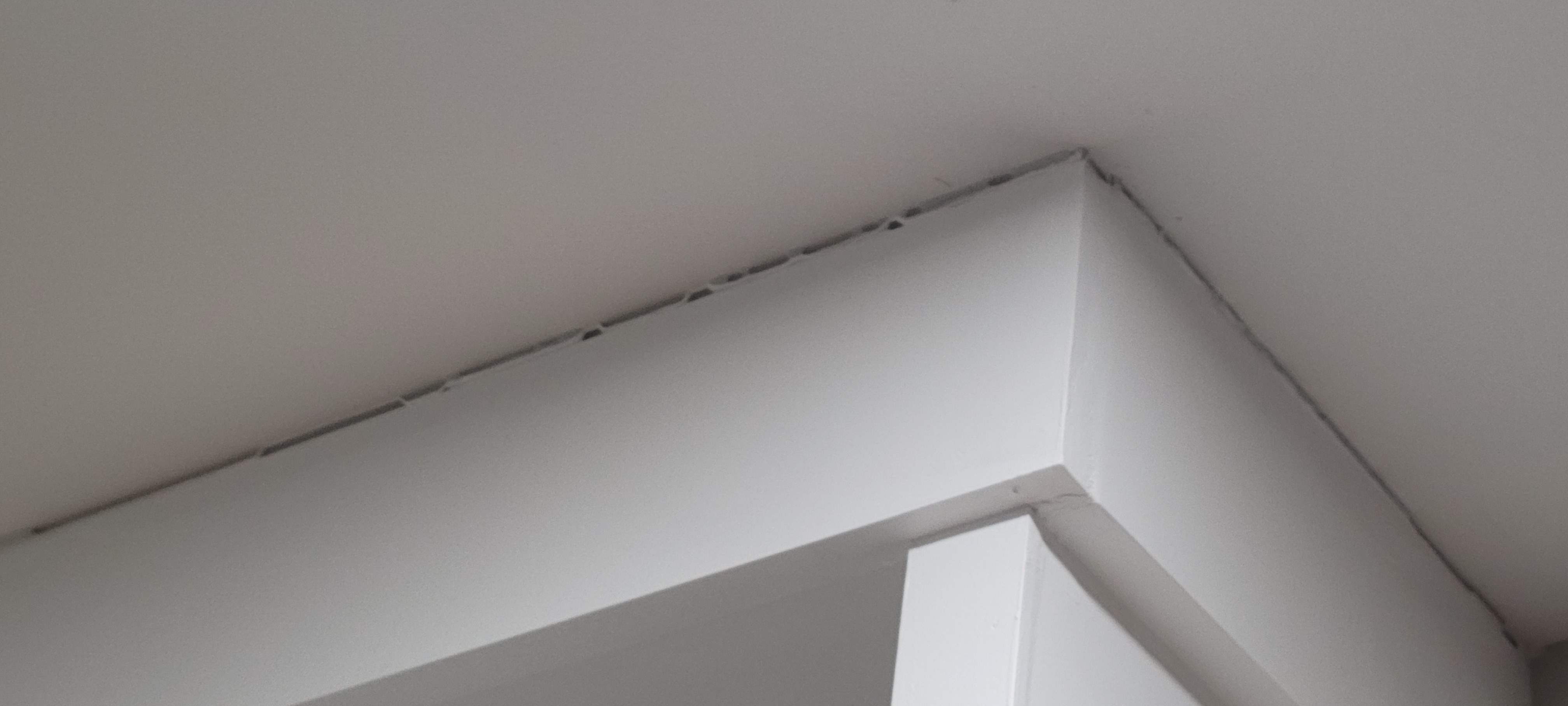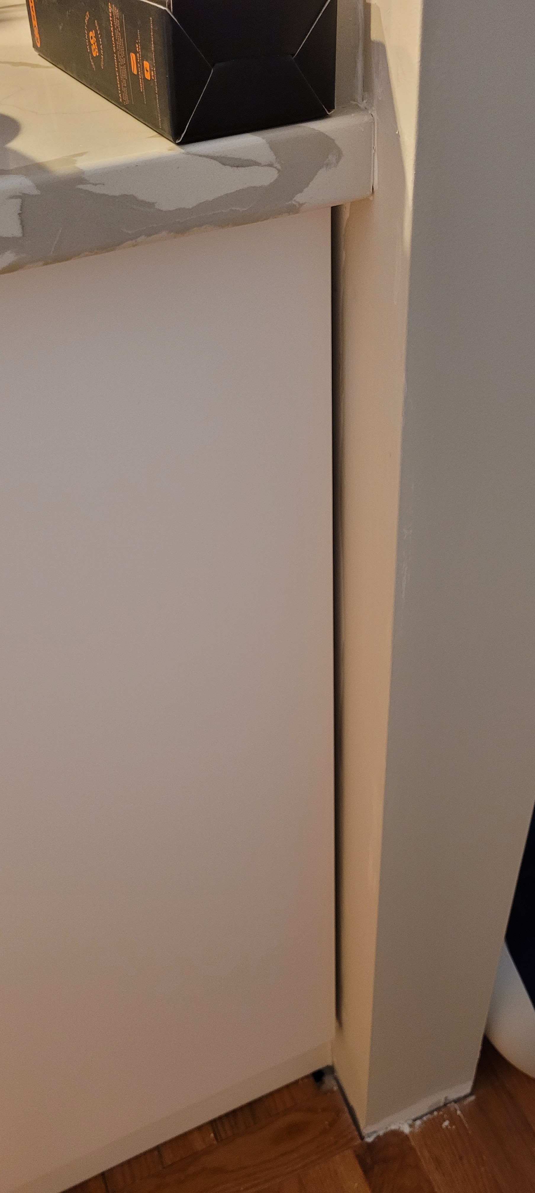 We loaded this thing up after we caulked, and naturally — because gravity — the weight pulled the entire unit down, hence the separation between crown and ceiling.