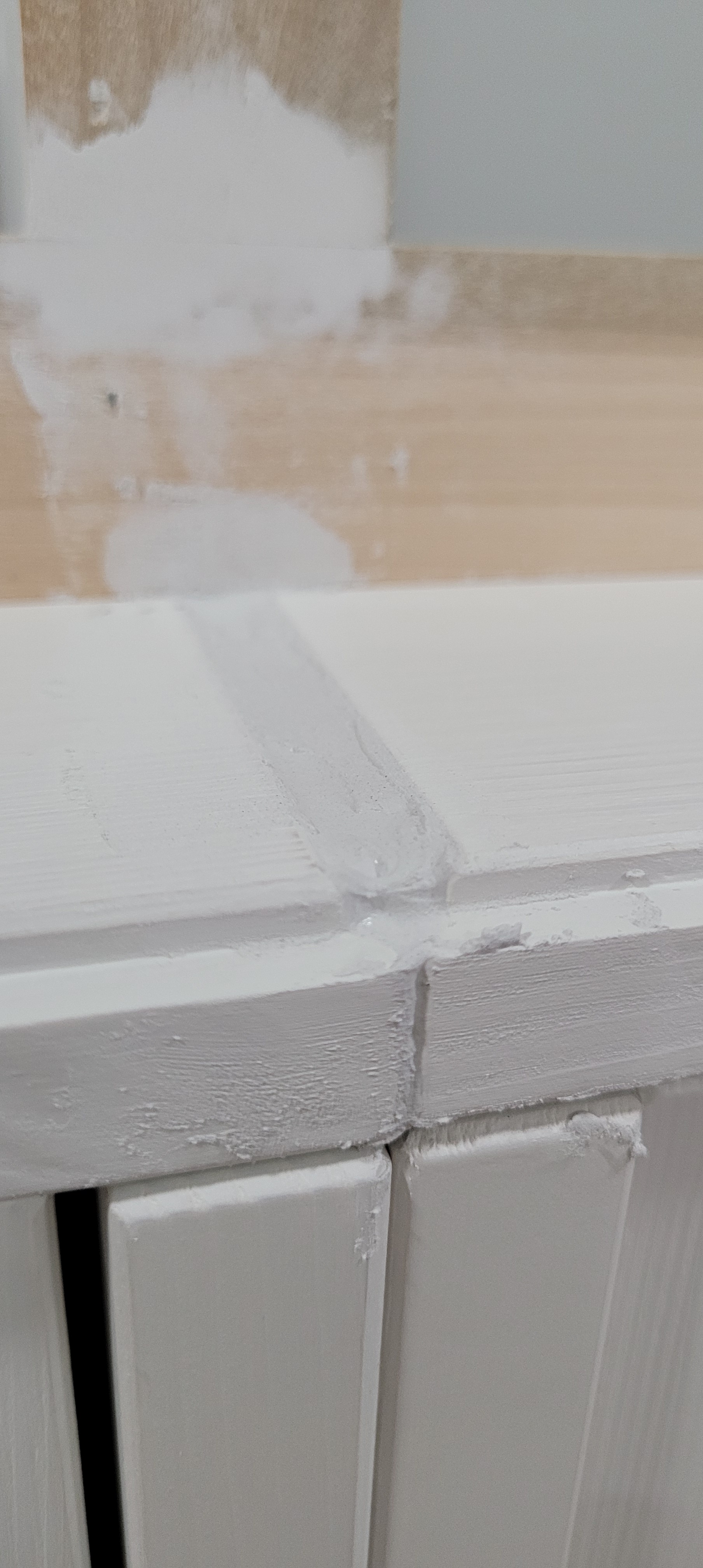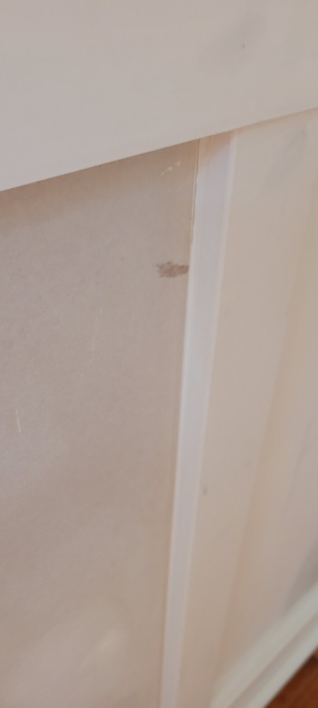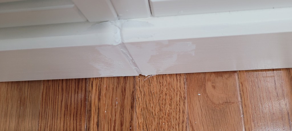 We had used our go-to stretchy caulk that has always worked wonders for us — and seemingly lasts for years without cracking or splitting. We soon realized where things went south on this piece, though — if you scroll back to the original pictures above, you will see the first easter egg (clue) to what likely caused this blessing-in-disguise tragedy.