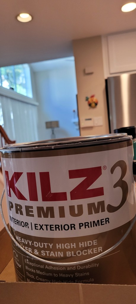 When the caulking trauma/drama was finally over and done with, we were able to apply the first coat of primer. Again, primer is necessary on bare drywall board, but it is also a must when you have applied wood filler, nail hole filler, and caulk — as those products can “flash” through to your finished wall. So, in an abundance of caution, we applied two full coats of Kilz 3 primer, sanding in between each coat for good adherence.