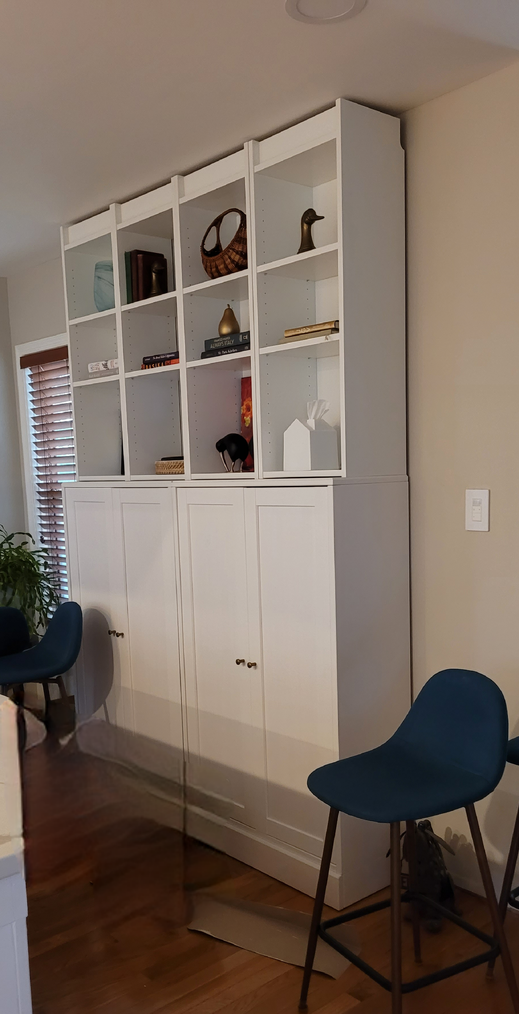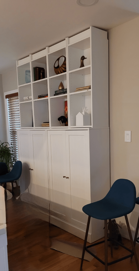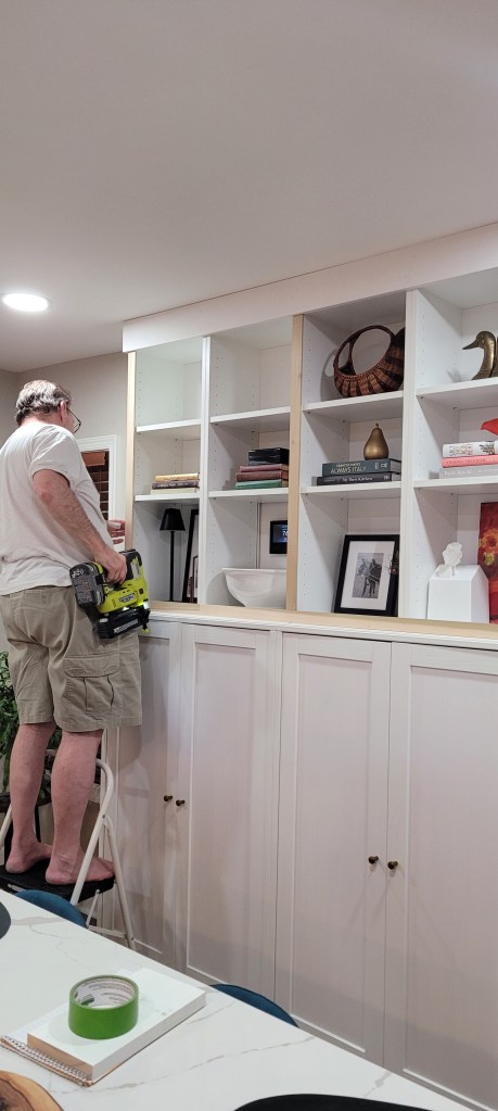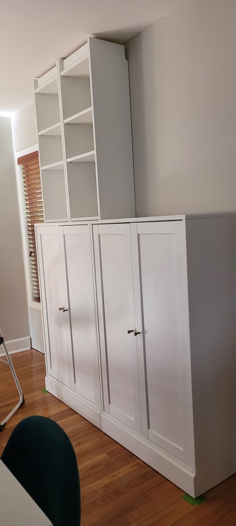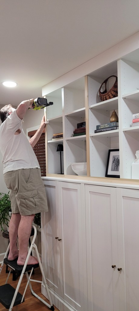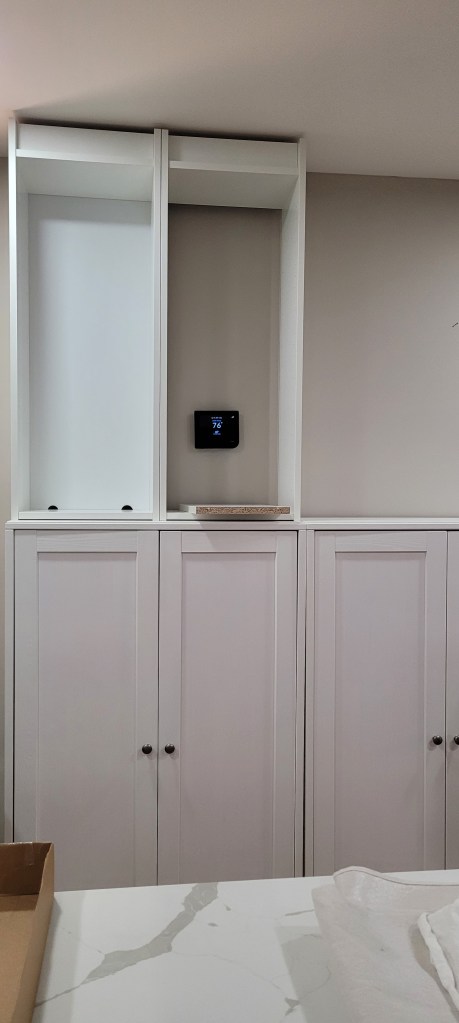 Why, yes, those are Ikea Billy cabinets on top, turned upside down. Spoiler alert, it will save us having to build out a crown at the top down the road.