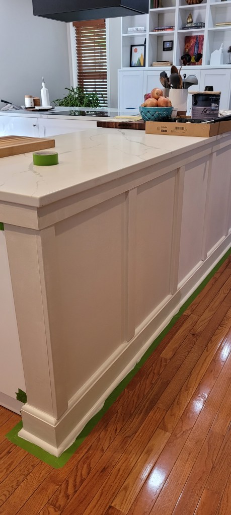 • Prime, at least twice, the entire island board and batten base, all the moulding, and then paint the whole kit and caboodle.