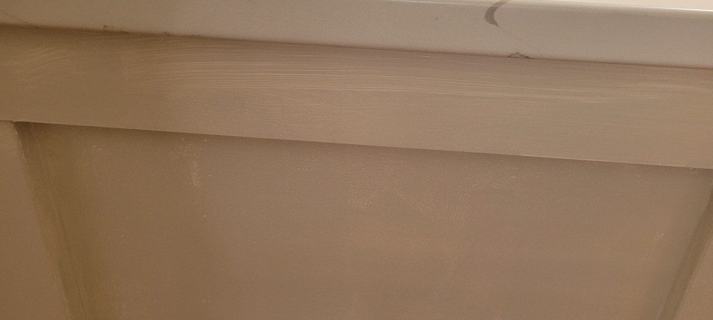 These photos are from the first coat. We will lightly sand the whole thing one more time, give it a second coat of primer, a second light sanding, all before applying color and painting the baseboards.