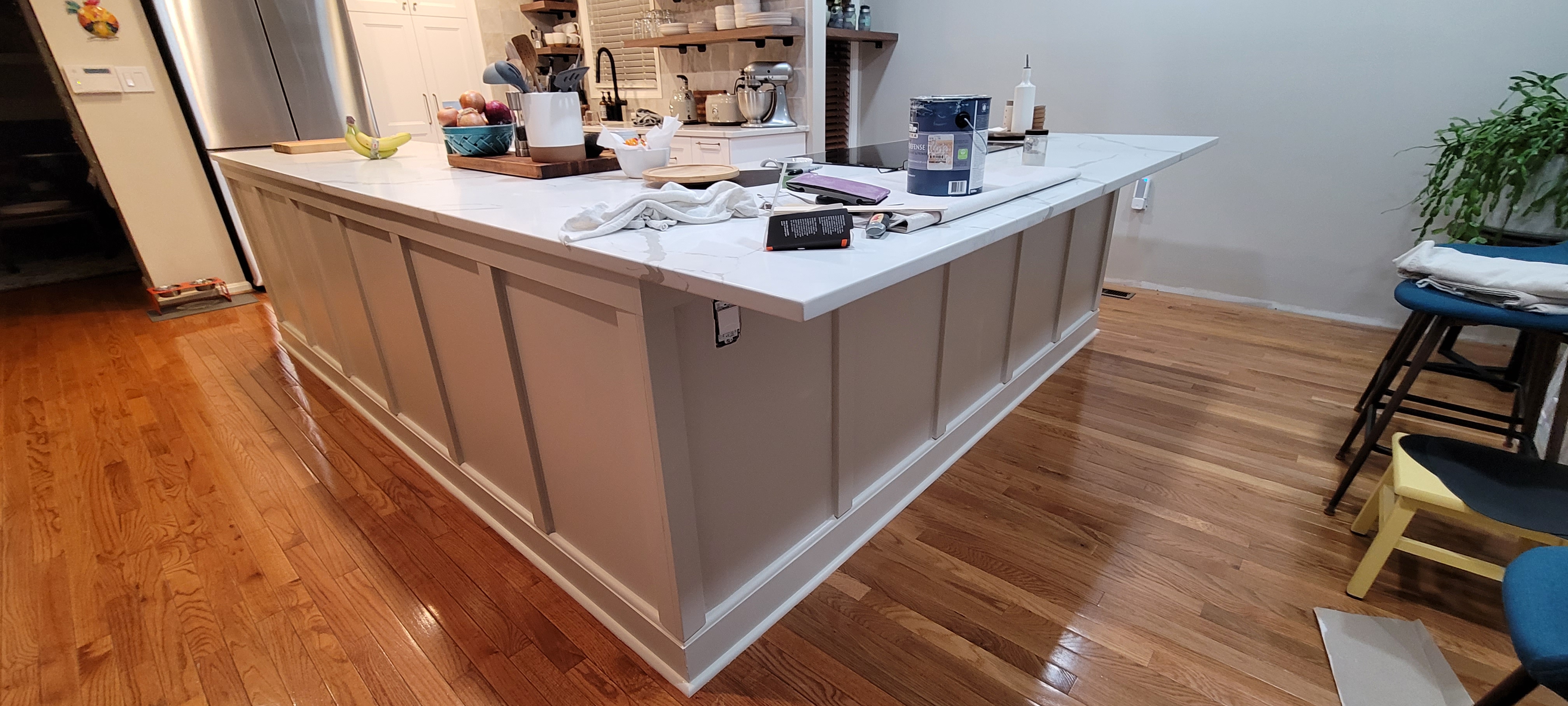 What had us in delay-delay-delay mode were two issues: the open shelving disaster/dilemma and how to finish out a very nook-and-crannyish massive island (11 ft by 8.5 ft), so we did what all good DIY-ers do. We took a break and worked on something else.