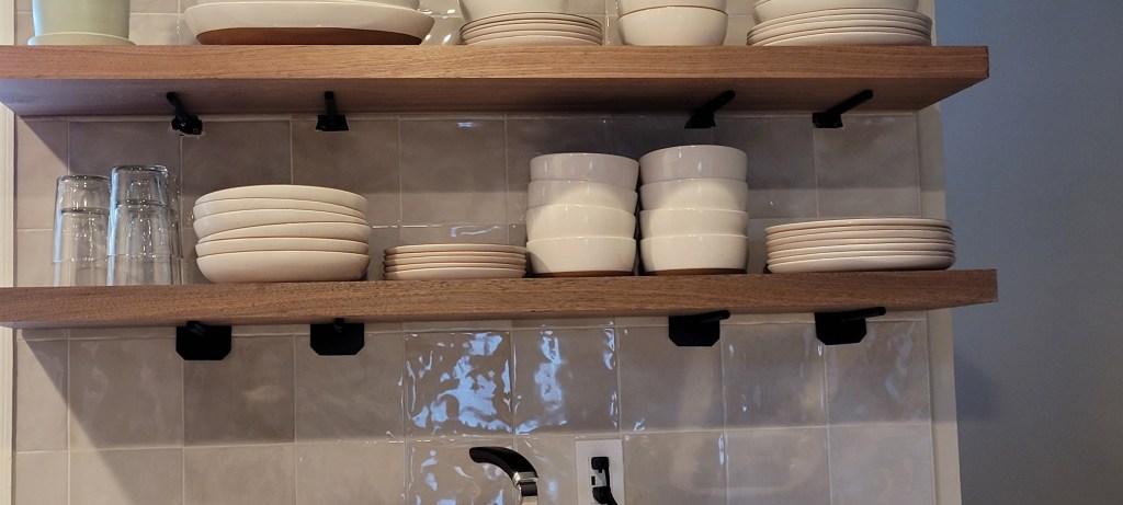After many late night conversations, tape measure pulls, and being attached to our level like it is an appendage, we have tabled the decision-making, for now. The shelves sitting on top of the posts provide the necessary storage to get on with our day, even if it also provides a bird’s eye view into how the open-shelving sausage is made.