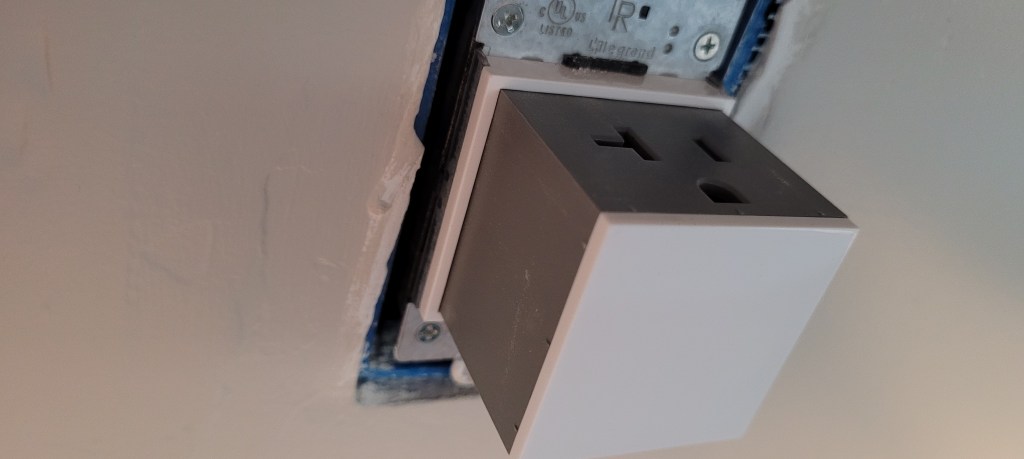 The device was about $80 and came with a screwless cover to match the other outlets in our home. I reasoned that if one’s knees accidentally grazed on an open outlet, a guest might be in for a bit of a shock, so doing this pop out version seemed safer. We wanted at least one extra outlet on the outside of the island for things like plugging in a vacuum cleaner or a piece of equipment.
