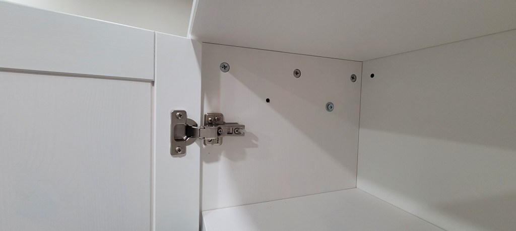 Today, we knocked out one of the small preparatory tasks which involved bolting the two cabinets together on the inside so that they could not separate down the line. In the next week or two, we will trim out all of the front facing connections, fill all of the shelving holes and sand them, caulk everything within an inch of its life, and then finally give it two to three coats of primer and another two coats of paint.