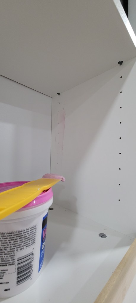 We also spackled the deep crevices which were created when we smushed the two base cabinets together. Again, this is to make a seamless built-in look. In the photo below, you can see that we filled it partially. Let it dry for a day or so, sanded, and then came back and filled it again with spackle. We repeated that process until the seam was…seamless 🙂 I forgot to snap a photo of that, but the proof will be in the pudding when the finished cabinet is revealed. Fingers crossed.