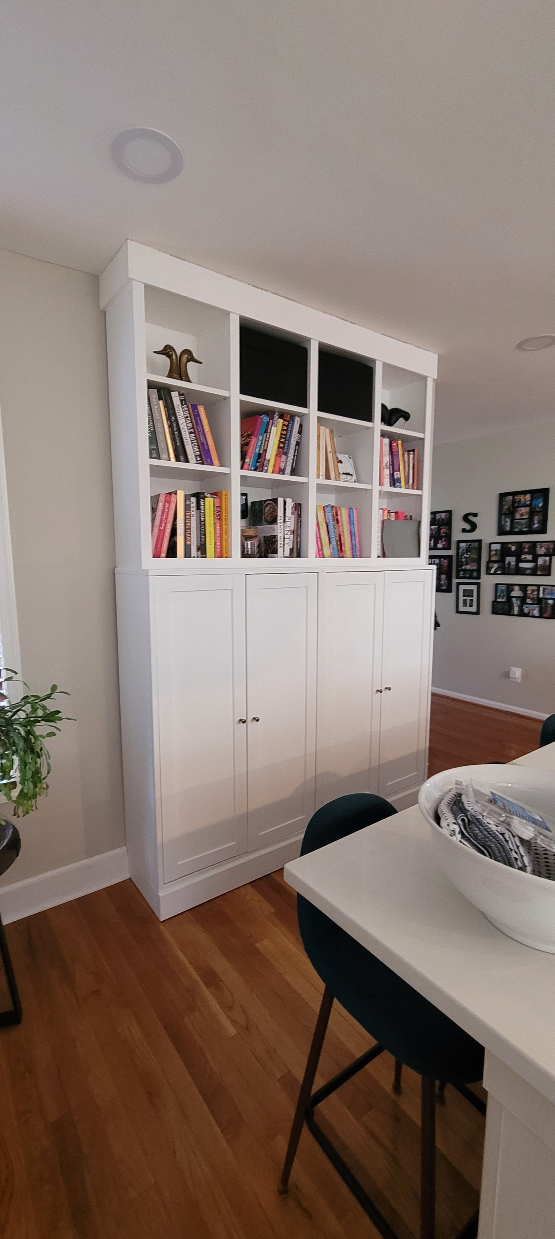 We used Ikea all-wood Havsta lowers and then added the ubiquitous Billys at the top