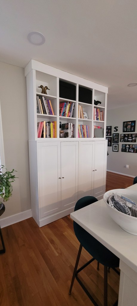 We found the idea/hack from a bunch of different DIY bloggers to use several different IKEA pieces to form built-in cabinetry using solid wood IKEA Havsta cabinets topped with less expensive Billys.