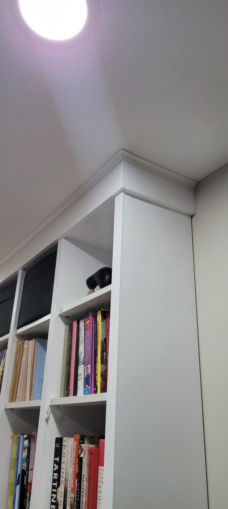 What we didn’t do was caulk the piece of crown trim to the ceiling prior to finishing. Once we get the thing painted out (I’m going to hyperventilate if I keep these big sighs up), we will load all the books and appliance back in and THEN caulk the ceiling.