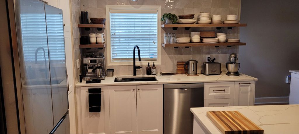 Even though our kitchen cabinets are white and our quartz countertops a creamy white, we have lots of pops of warm walnut open shelving and putty grey veining in the quartz that helps keep the kitchen from looking too sterile and cold.