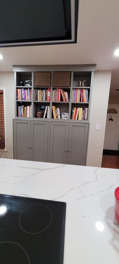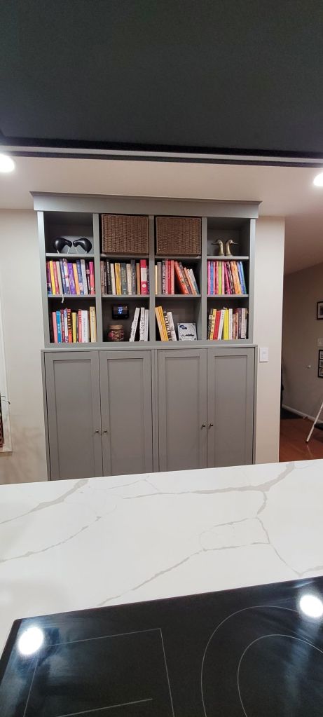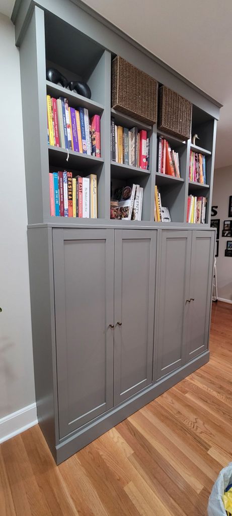 When the piece was originally finished, painted and caulked, we got to work loading it up with all the fun stuff it was meant to house. In the interior cabinets were small appliances and pantry items like canned and jarred goods. In the upper open shelving were a ton (remember that word, your second easter egg of this debacle) of books in my cookbook collection.